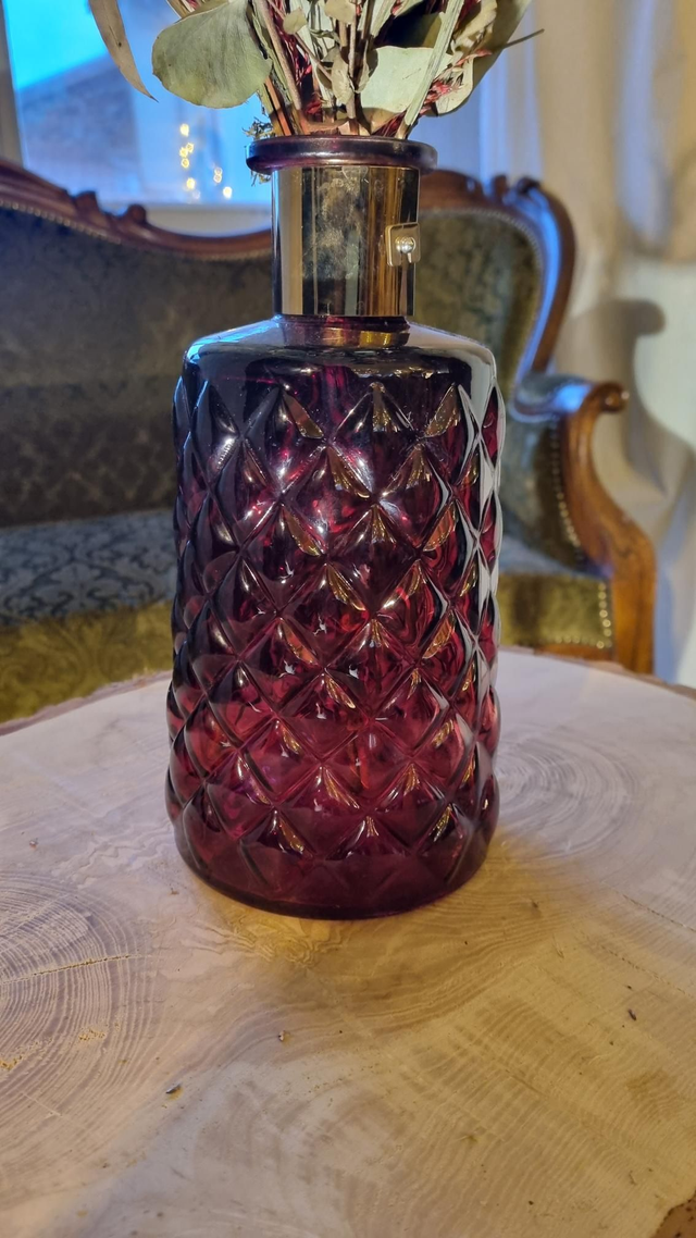 Bouquet de fleurs séchées dans les teintes : vert / beige / rouge ; dans un vase en verre texturé rouge et bague dorée.